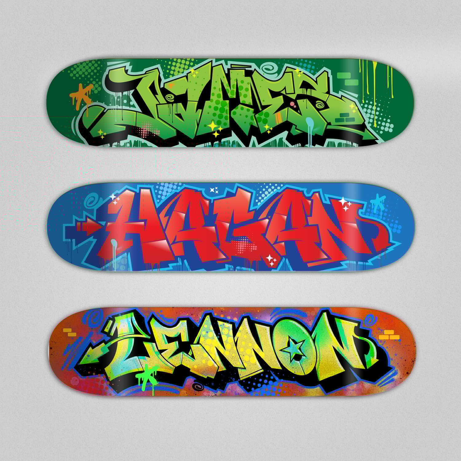 This product is made-to-order. Please let us know the name and colors you'd like on the skateboard deck in the "Notes or instructions" from the checkout page.